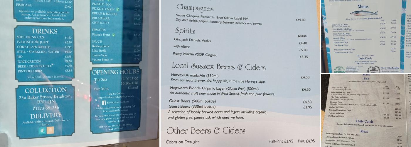 Bardsley's is a popular fish and chip shop in Brighton that welcomes dogs and offers a pleasant dining experience. The service is fast, attentive, and kind, with complimentary water for pets. Customers enjoy the lovely food, including the cod and chips and batterer sausage with chips, along with tasty mushy peas. Although there may be a slight wait, the meals are fresh and hot. The restaurant also provides condiments and a souvenir postcard at the end, making it a favourite among locals and visitors alike.